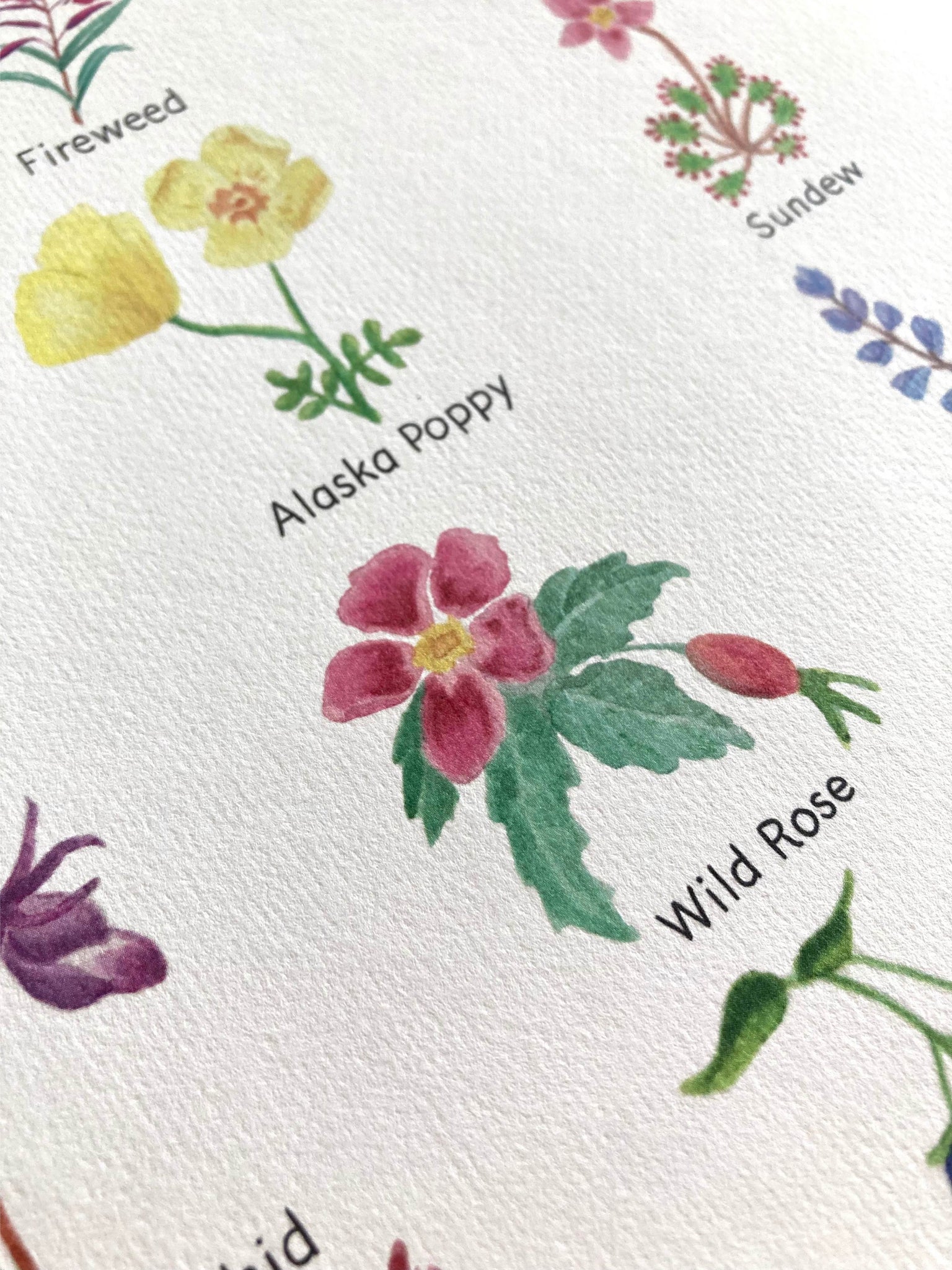 Celebrate the colorful charm of Alaska’s wildflowers year-round. This art print features a vibrant collection of blooms found across Alaska’s diverse landscapes. From alpine meadows to coastal trails, each watercolor image is hand illustrated. Perfect for decorating your home, office or anywhere else you want a touch of blooming Alaska beauty.