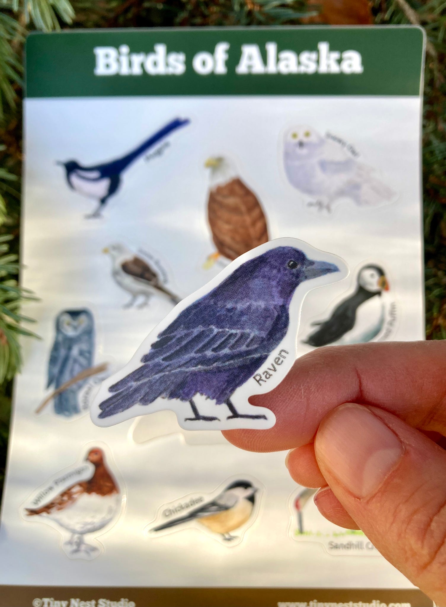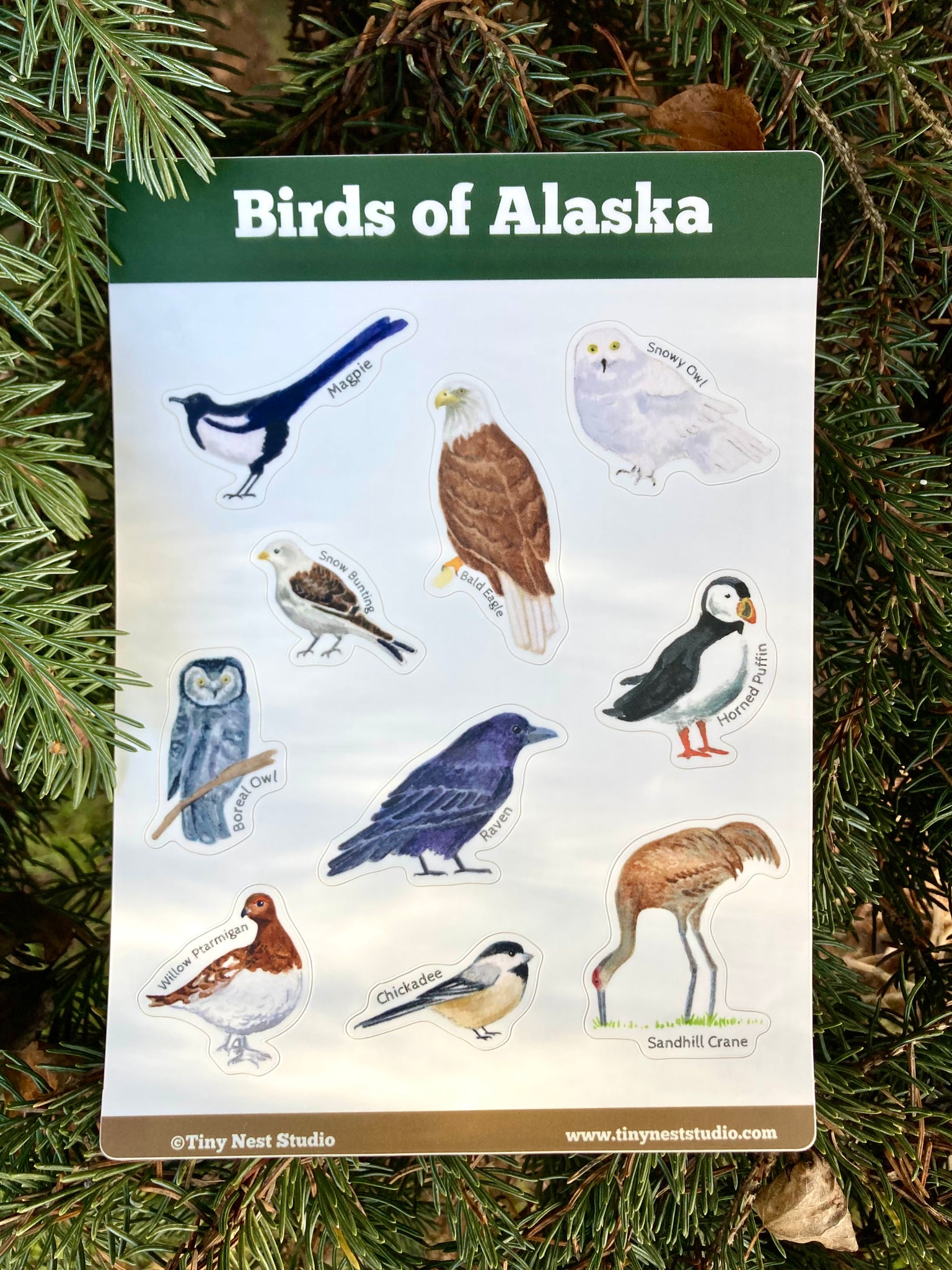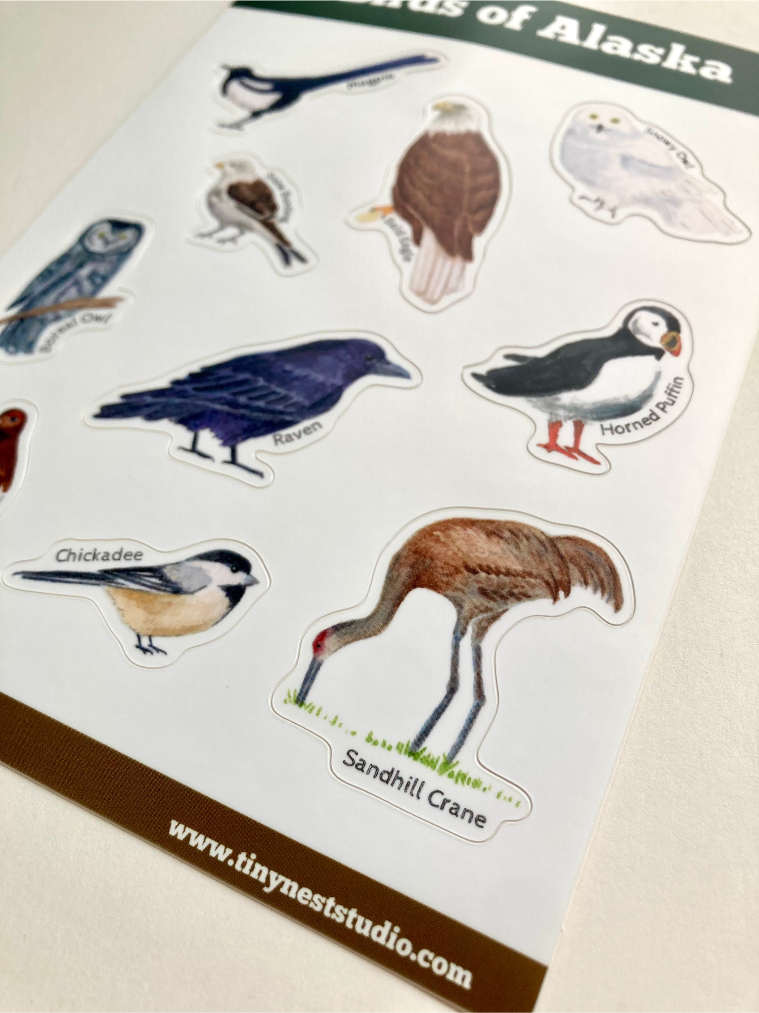 Celebrate the wild beauty of Alaska’s birds year-round. This sticker sheet features a variety of iconic bird species seen across Alaska’s diverse landscapes. From songbirds to seabirds, each watercolor image is hand illustrated with care and character. Perfect for decorating your water bottle, laptop, phone case, or anywhere else you want a touch of feathered Alaska charm.